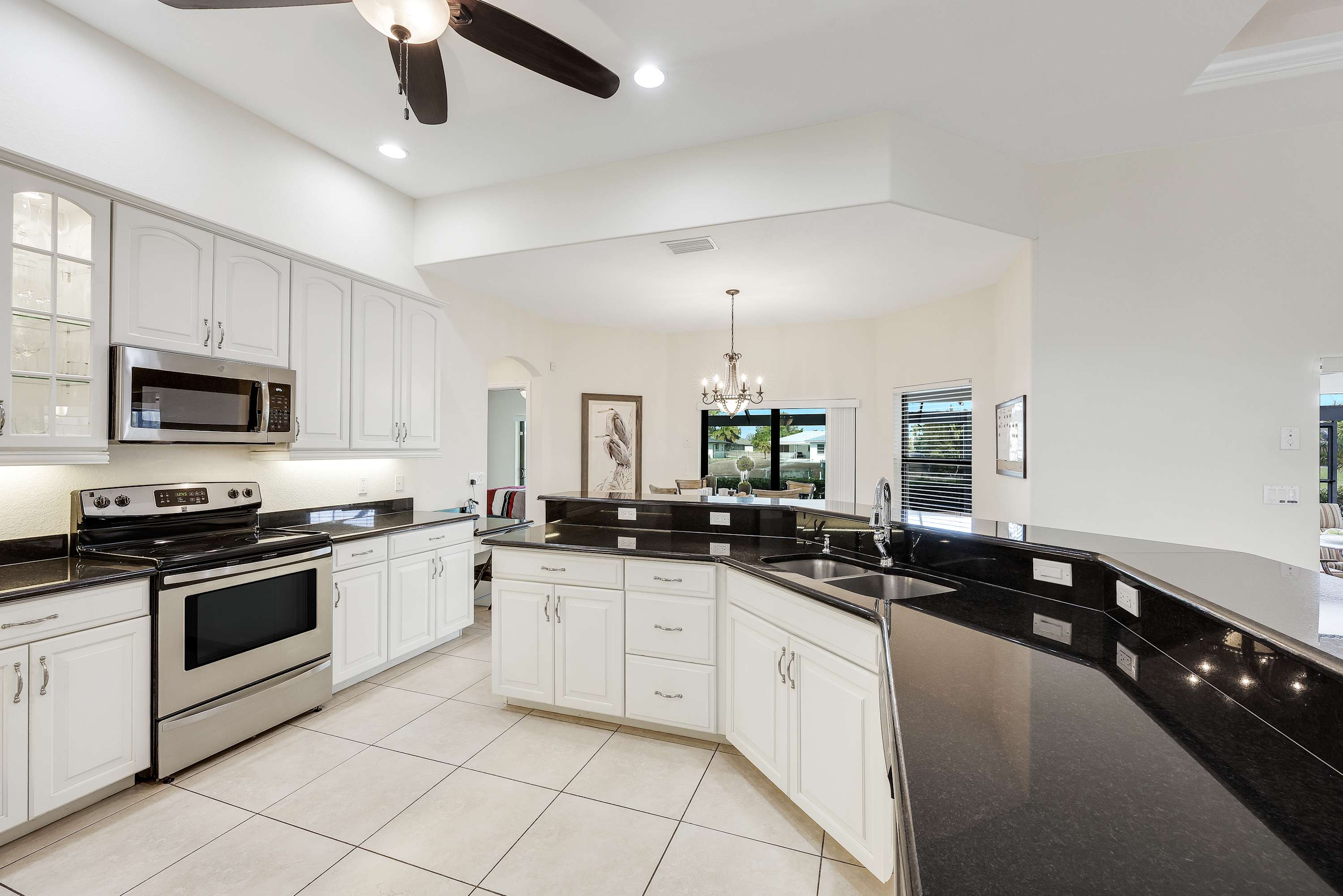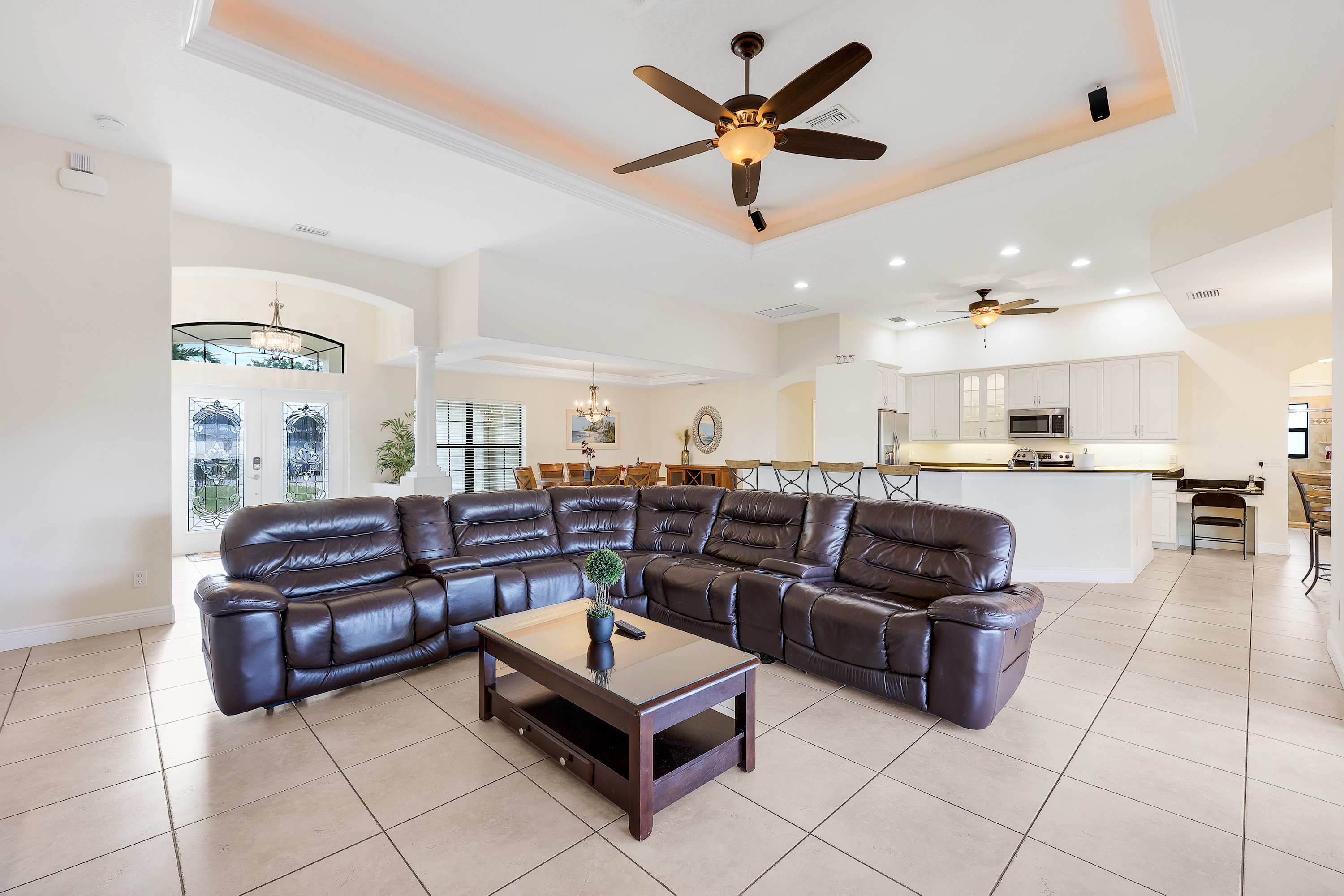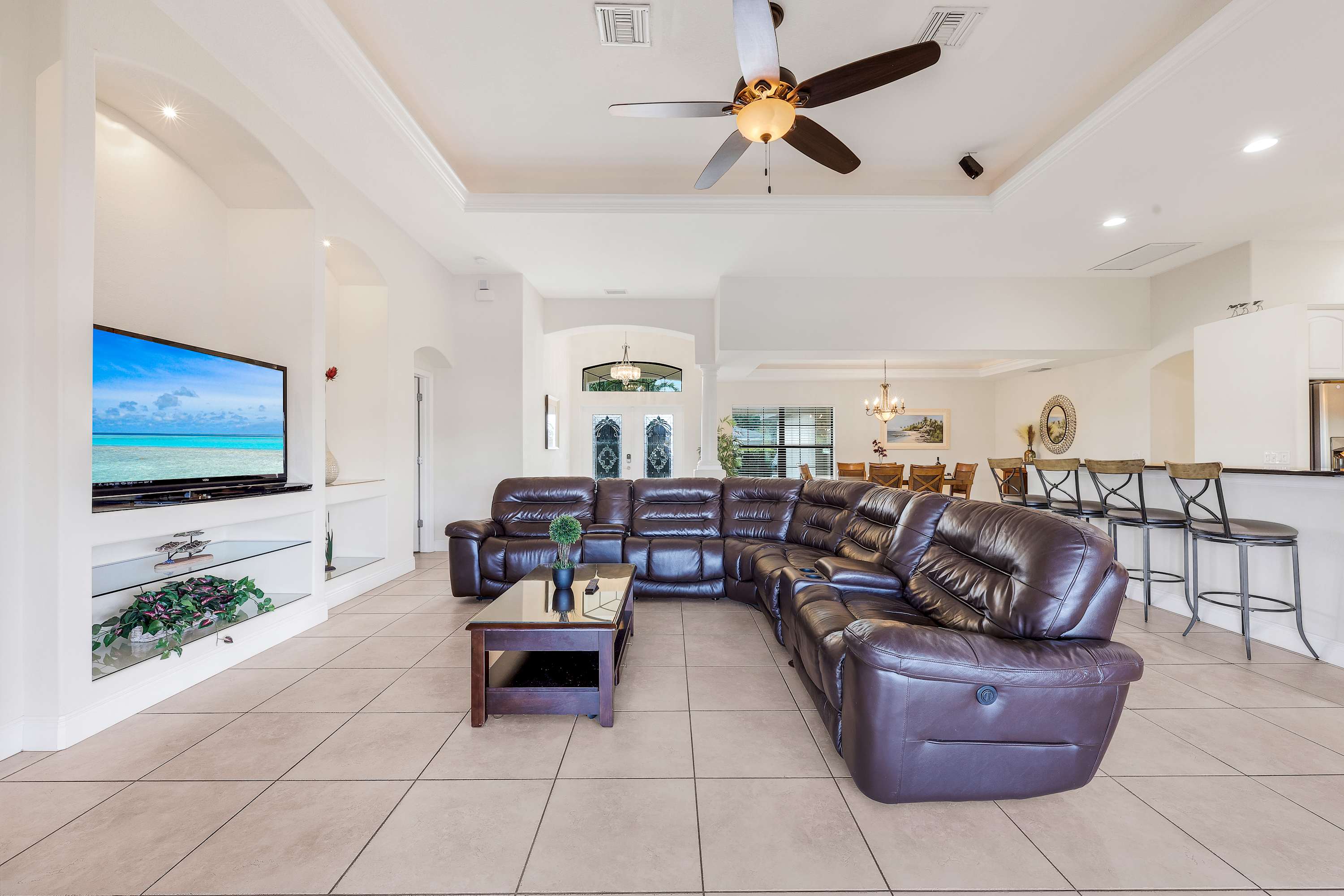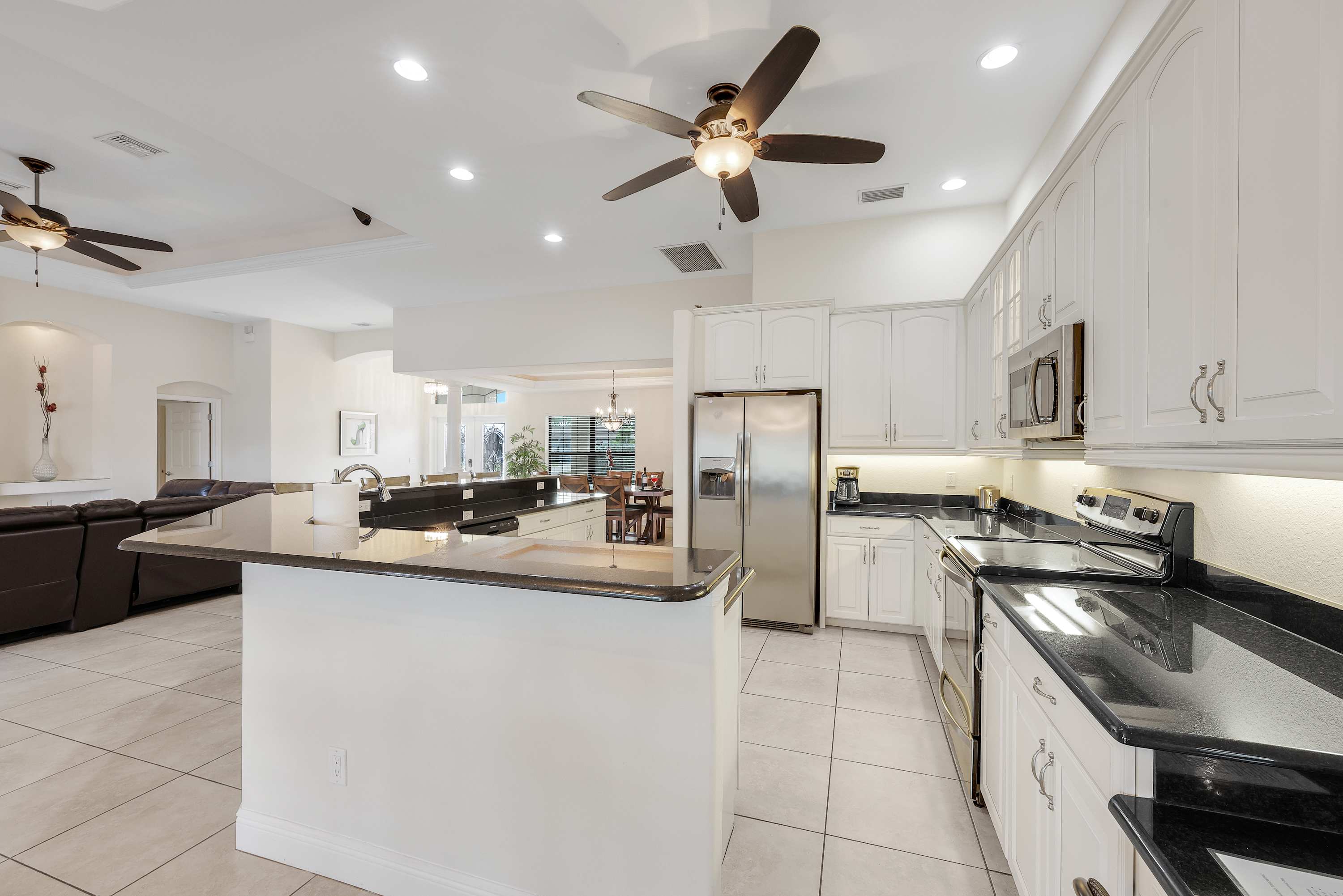 The huge living room features a plush leather sectional and large flatscreen TV —perfect for movie nights. Overlooking the space is a stylish breakfast bar with seating for five, a cozy breakfast nook with backyard views , and a formal dining area that seats six for memorable family meals. The spacious kitchen is beautifully appointed with stainless-steel appliances and everything you need for effortless cooking. Wi-Fi is, of course, included.