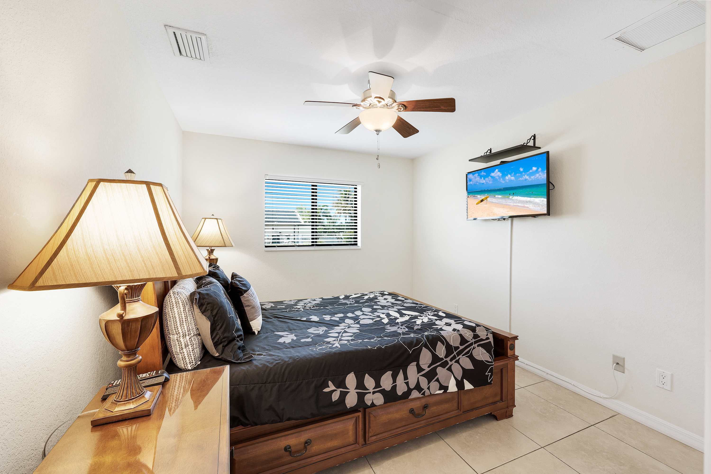 The master suite boasts a regal king-size bed , a spa-like bathroom with soaking tub and walk-in shower , and direct access to the pool. Two additional bedrooms include comfortable queen-size beds, while the fourth has two twin beds—perfect for kids! Three bedrooms include flatscreen TVs for added convenience.