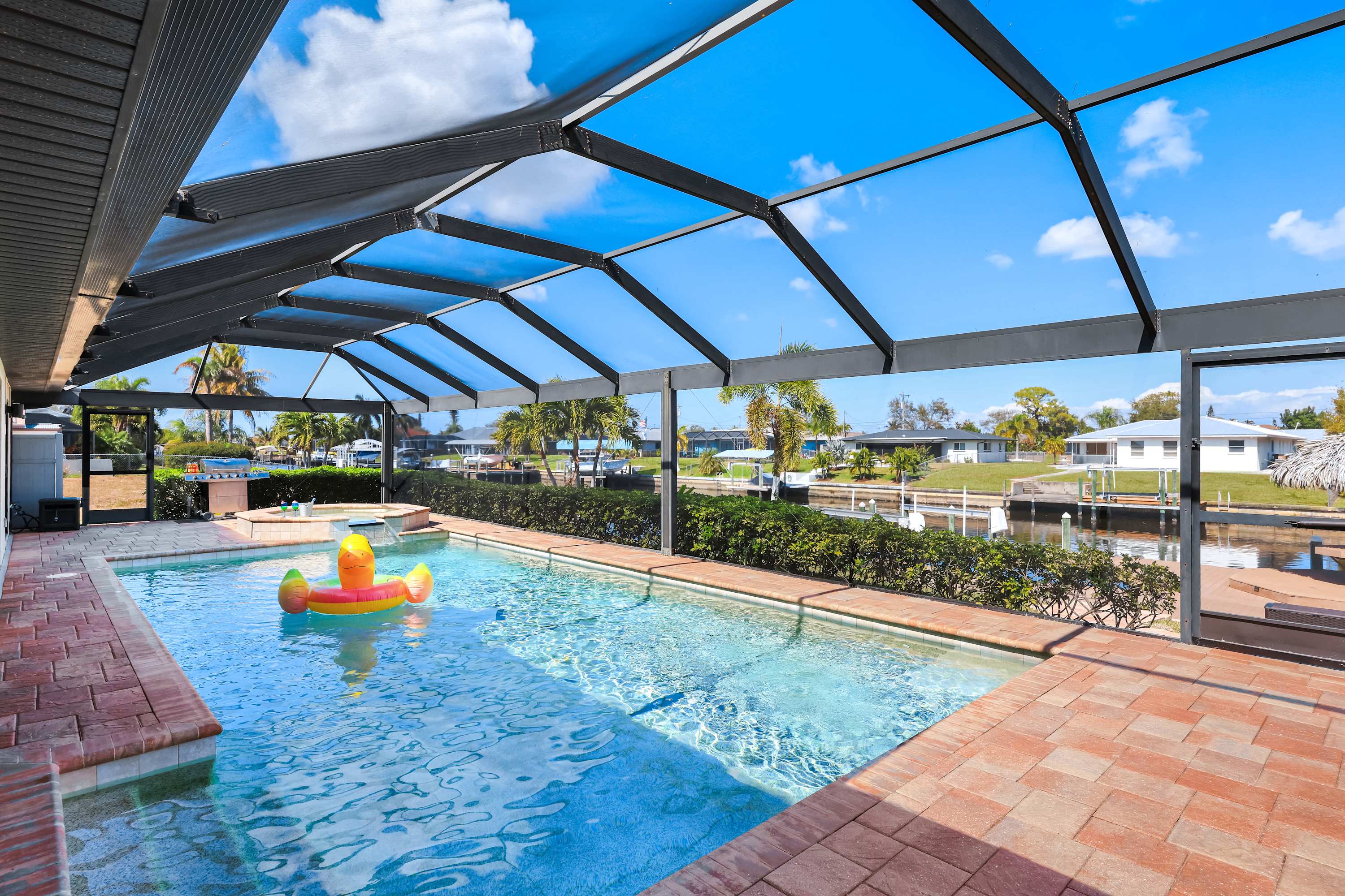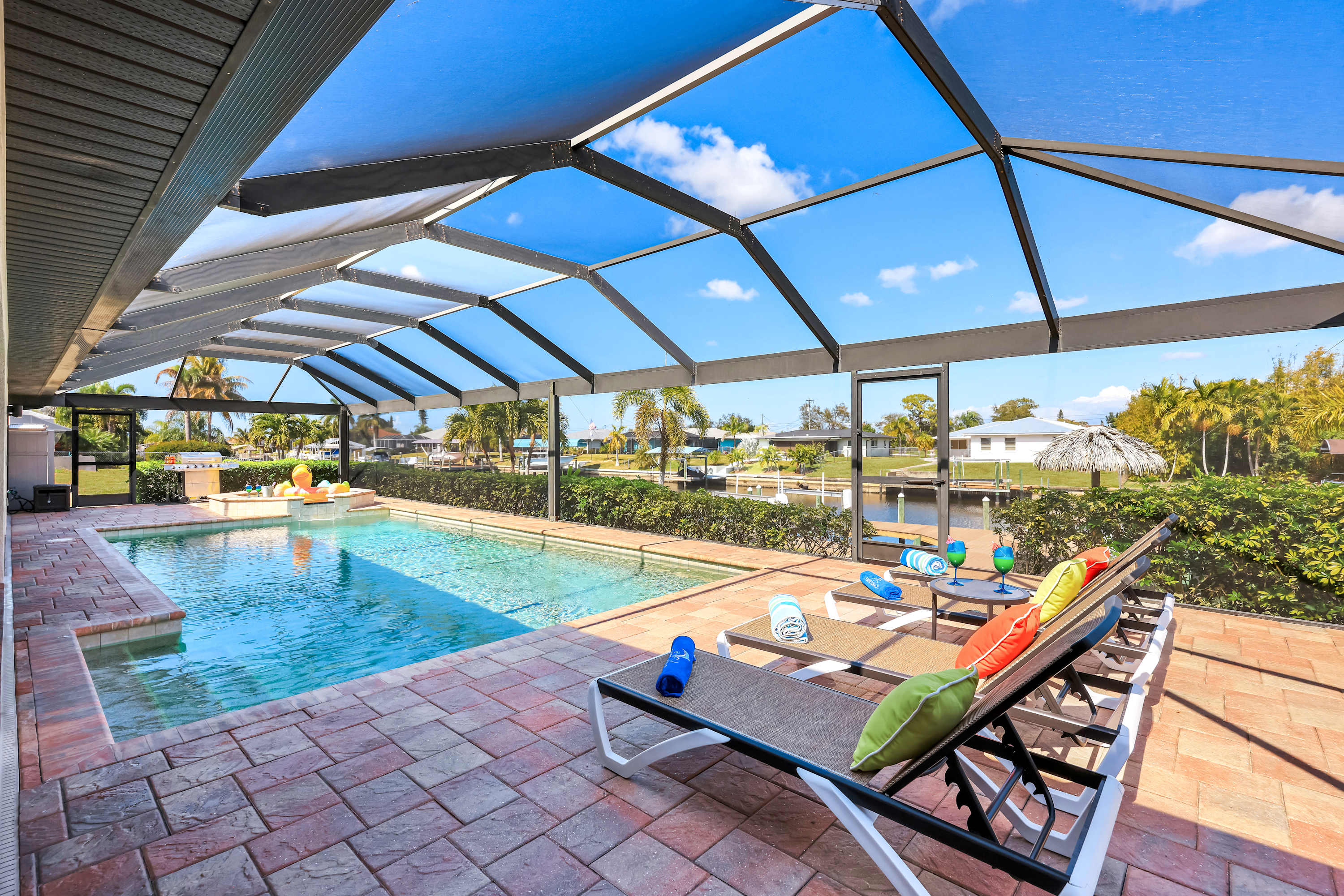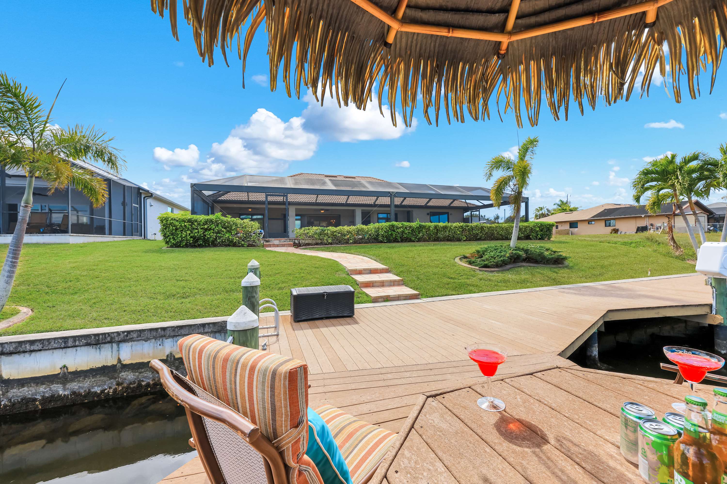 Beyond the screened enclosure, you’ll find a lush grassy play area, your own private dock, and a charming Tiki Hut —a perfect spot for morning coffee or evening cocktails as boats cruise by . Guests have complete access to the entire outdoor area, including the pool, spa, deck, grill, lawn, dock, and Tiki Hut. Bring your boat or rental and enjoy direct ocean access from the canal!