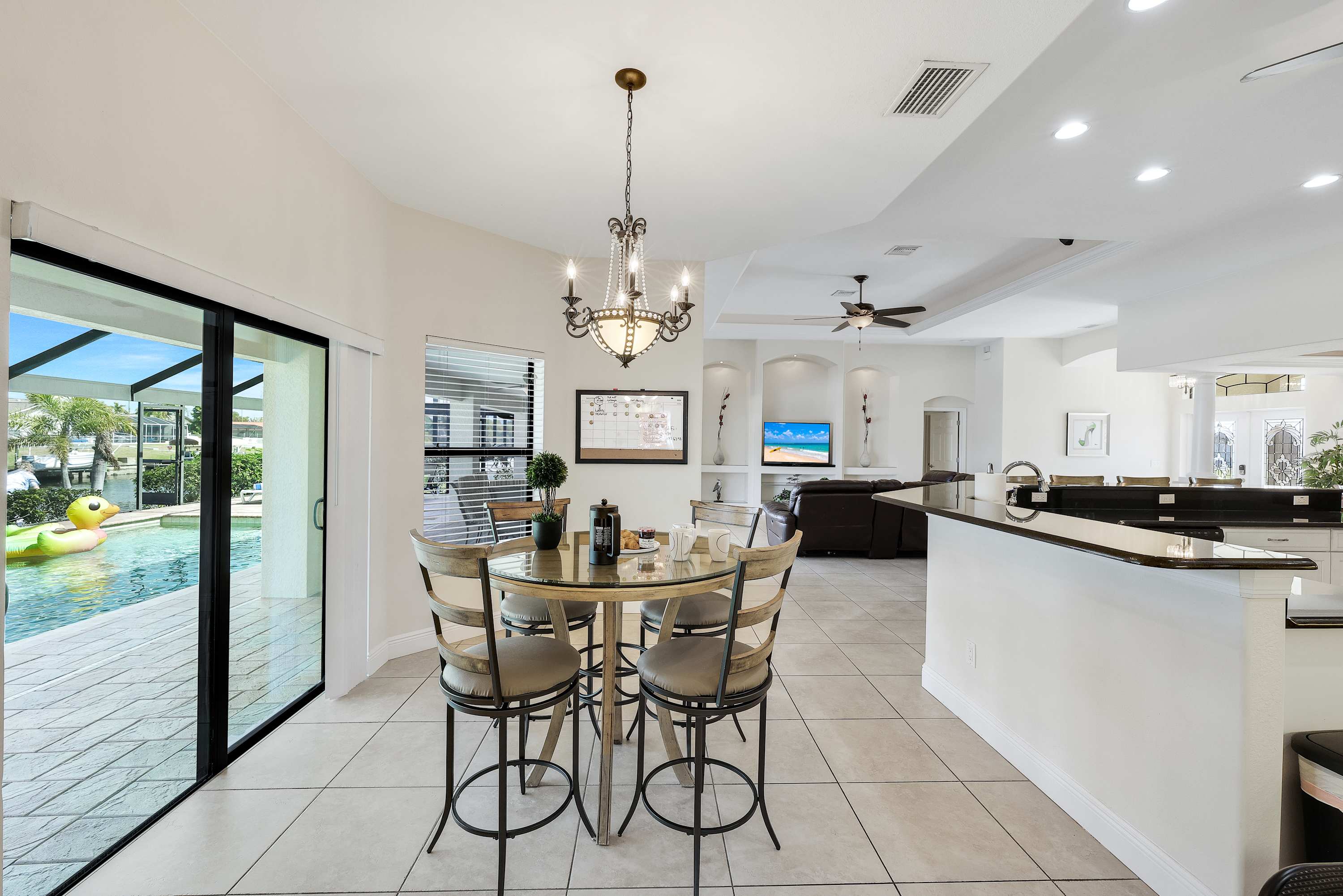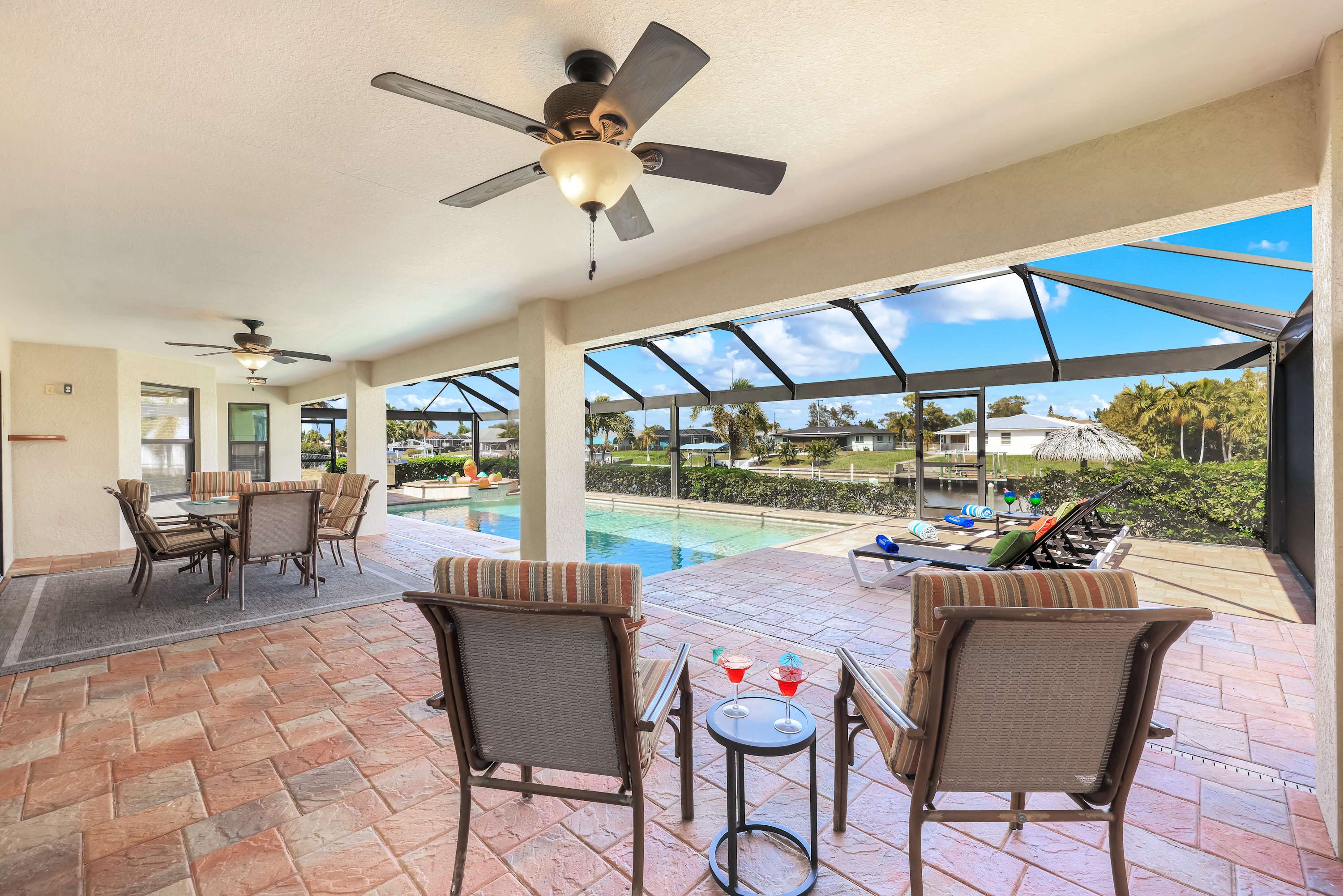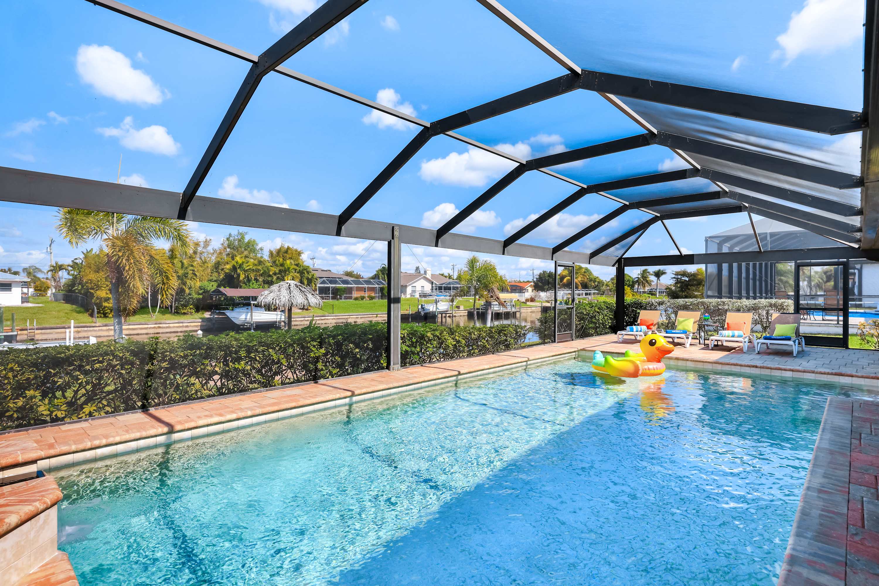 Beyond the screened enclosure, you’ll find a lush grassy play area, your own private dock, and a charming Tiki Hut —a perfect spot for morning coffee or evening cocktails as boats cruise by . Guests have complete access to the entire outdoor area, including the pool, spa, deck, grill, lawn, dock, and Tiki Hut. Bring your boat or rental and enjoy direct ocean access from the canal!
