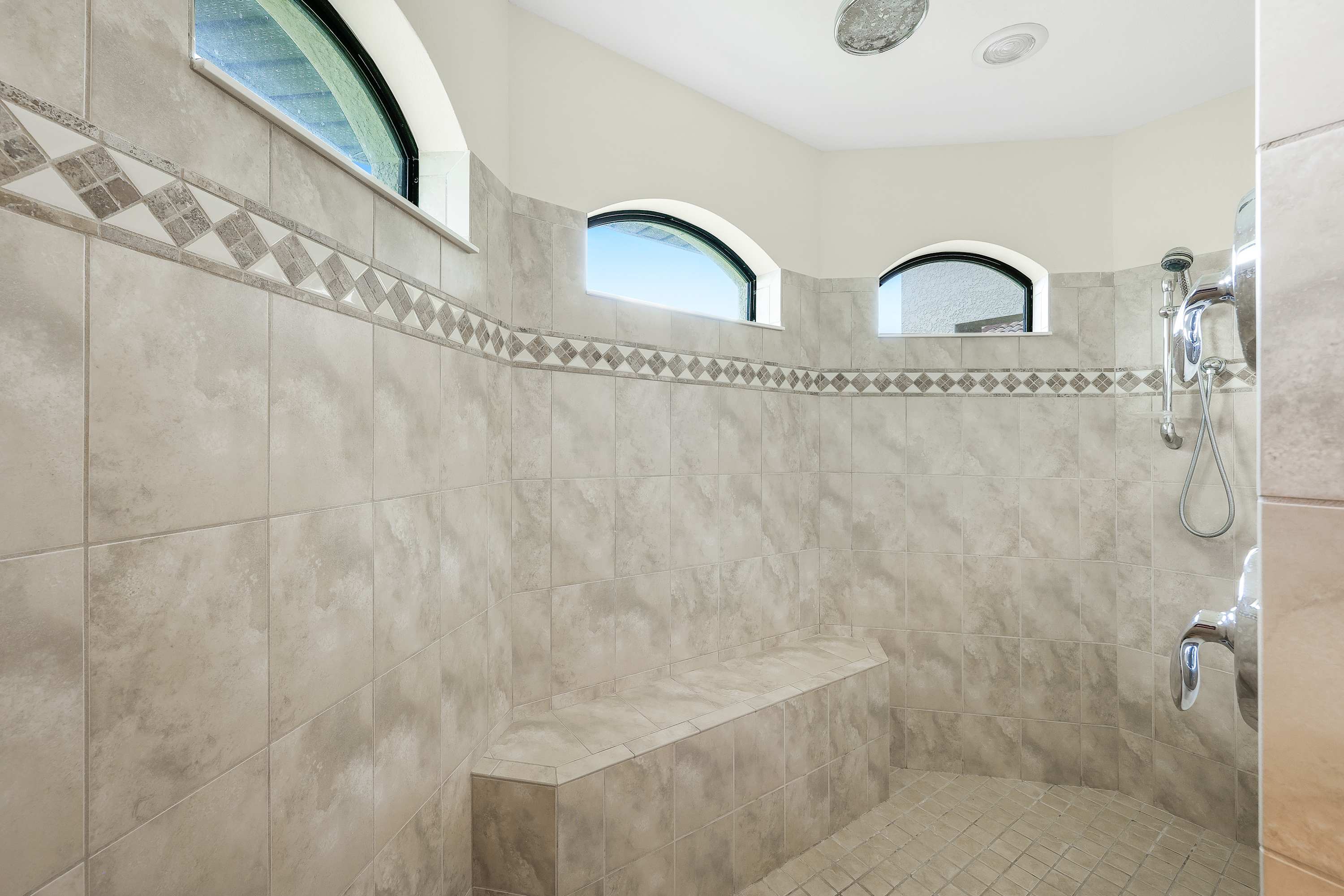The master bathroom has a huge walk in shower