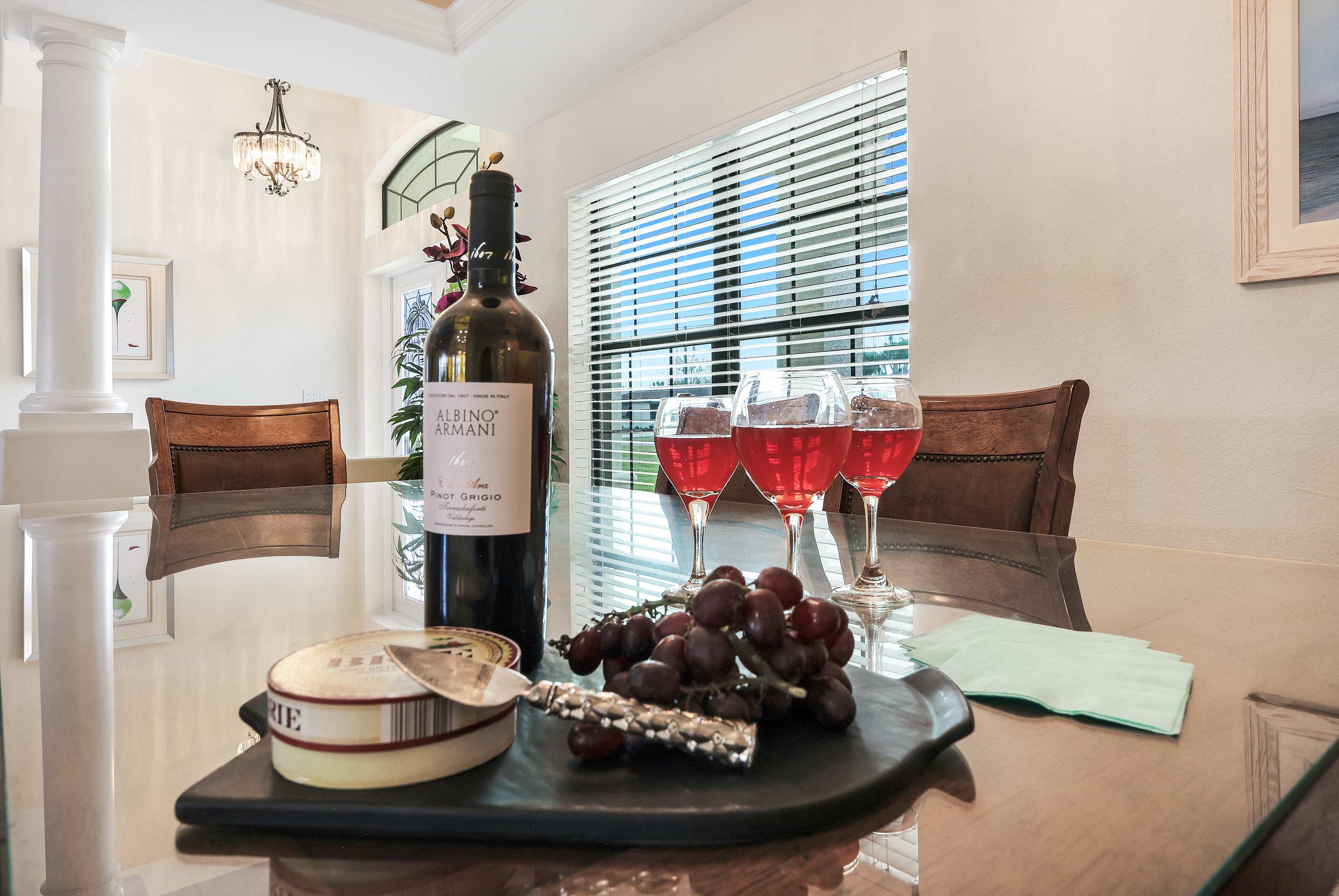The house is decorated lovely, but with 12' or higher ceilings and tiled floors, the acoustics are terrible. The sound echoed everywhere. Possibly the placement of area rugs would help stifle the noise. The kitchen was well stocked with everything needed!