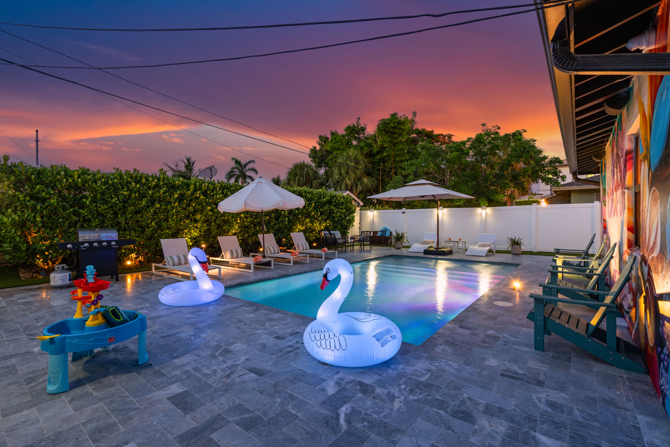 ?? Resort-Style Backyard Oasis: Your private, fully fenced backyard is a showstopper — day or night. Heated saltwater pool with color-changing LED lights Stunning artsy mural that glows beautifully in the evening (excellent for vacation photos!) Genuine stone pavers surrounding the pool Comfortable loungers, umbrellas & outdoor seating Gas grill for BBQ nights Bluetooth speakers for poolside music Bicycles and outdoor toys included Whether you’re sunbathing, swimming, dining al fresco, or simply relaxing under the stars, this backyard is designed for unforgettable memories.