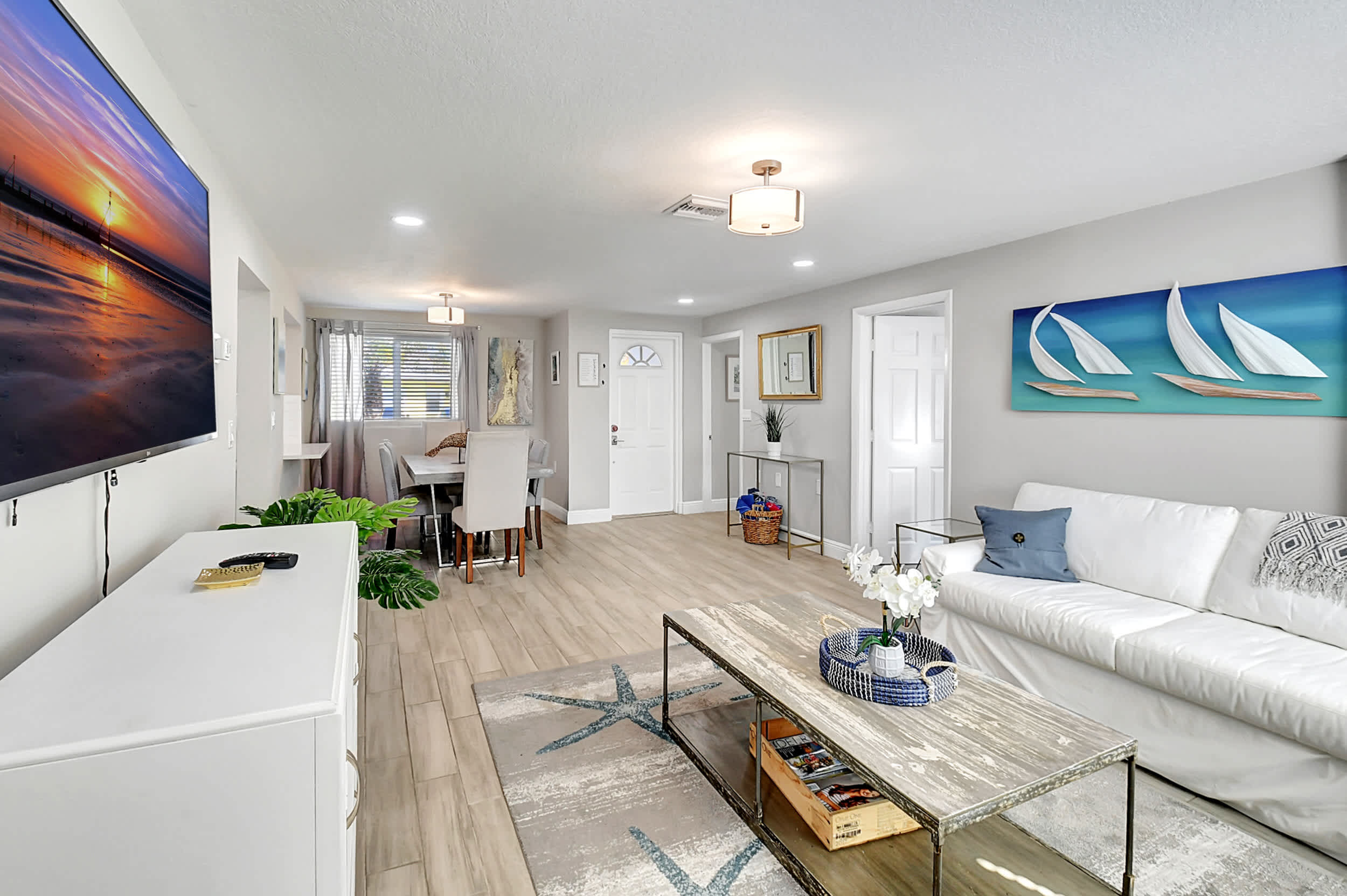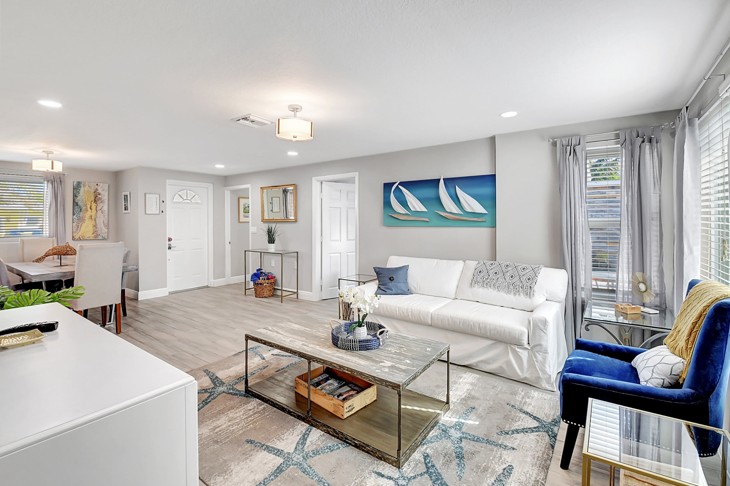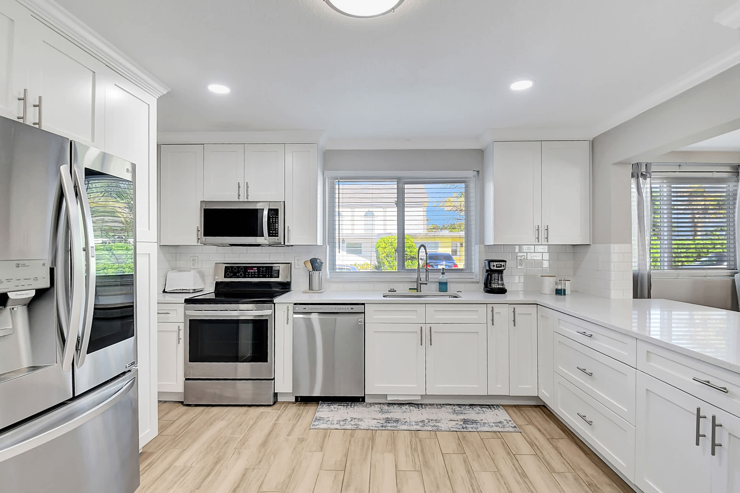 Interior: Step inside to an open, sun-filled interior featuring large windows, high-end porcelain tile flooring, and thoughtful coastal décor throughout. The fully renovated kitchen is a chef’s delight with stainless-steel appliances, sleek cabinetry, and a work desk perfect for your laptop or morning coffee. Enjoy meals together at the dining table for six, then unwind in the living area or head outside to your private backyard oasis.