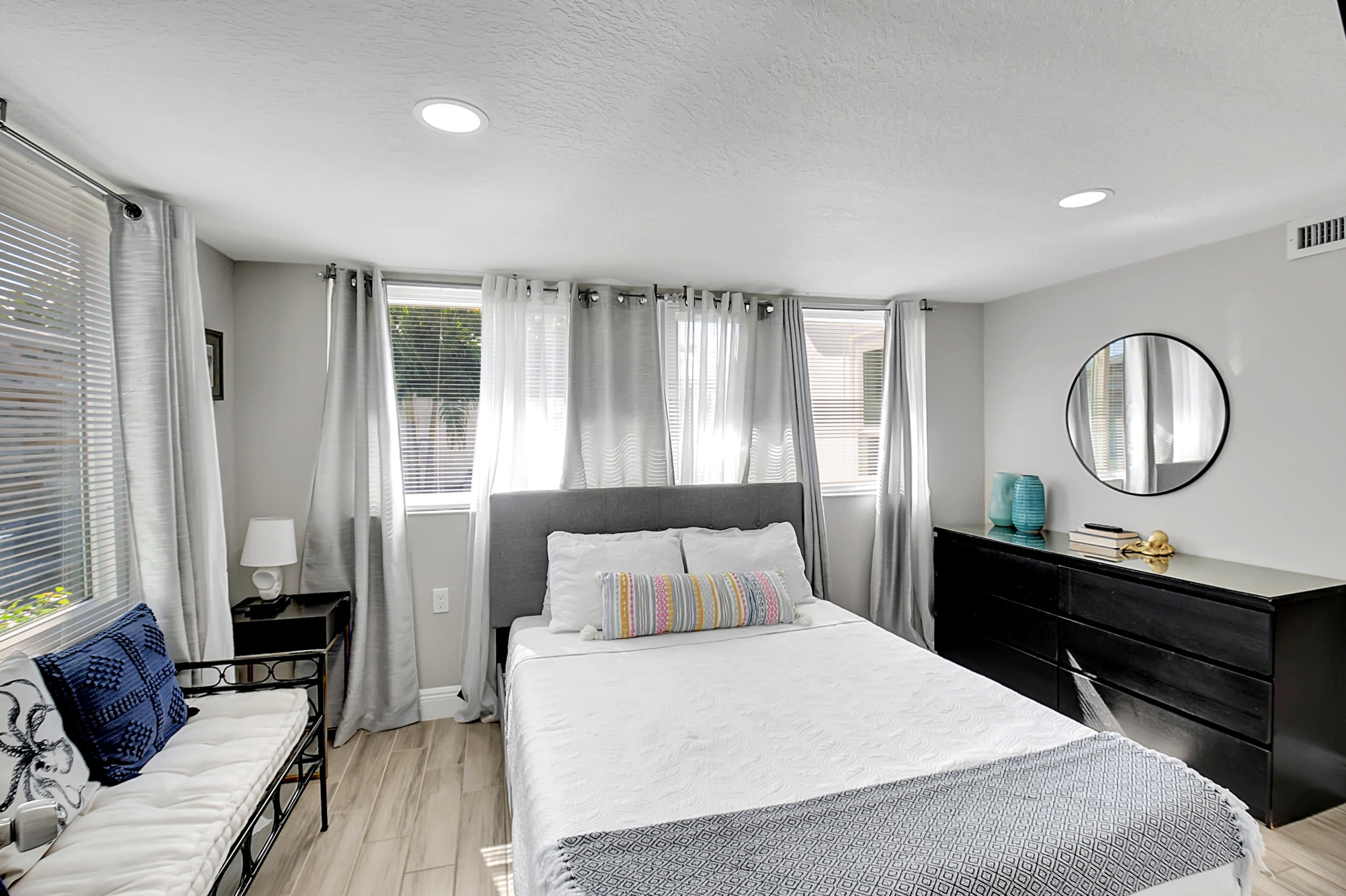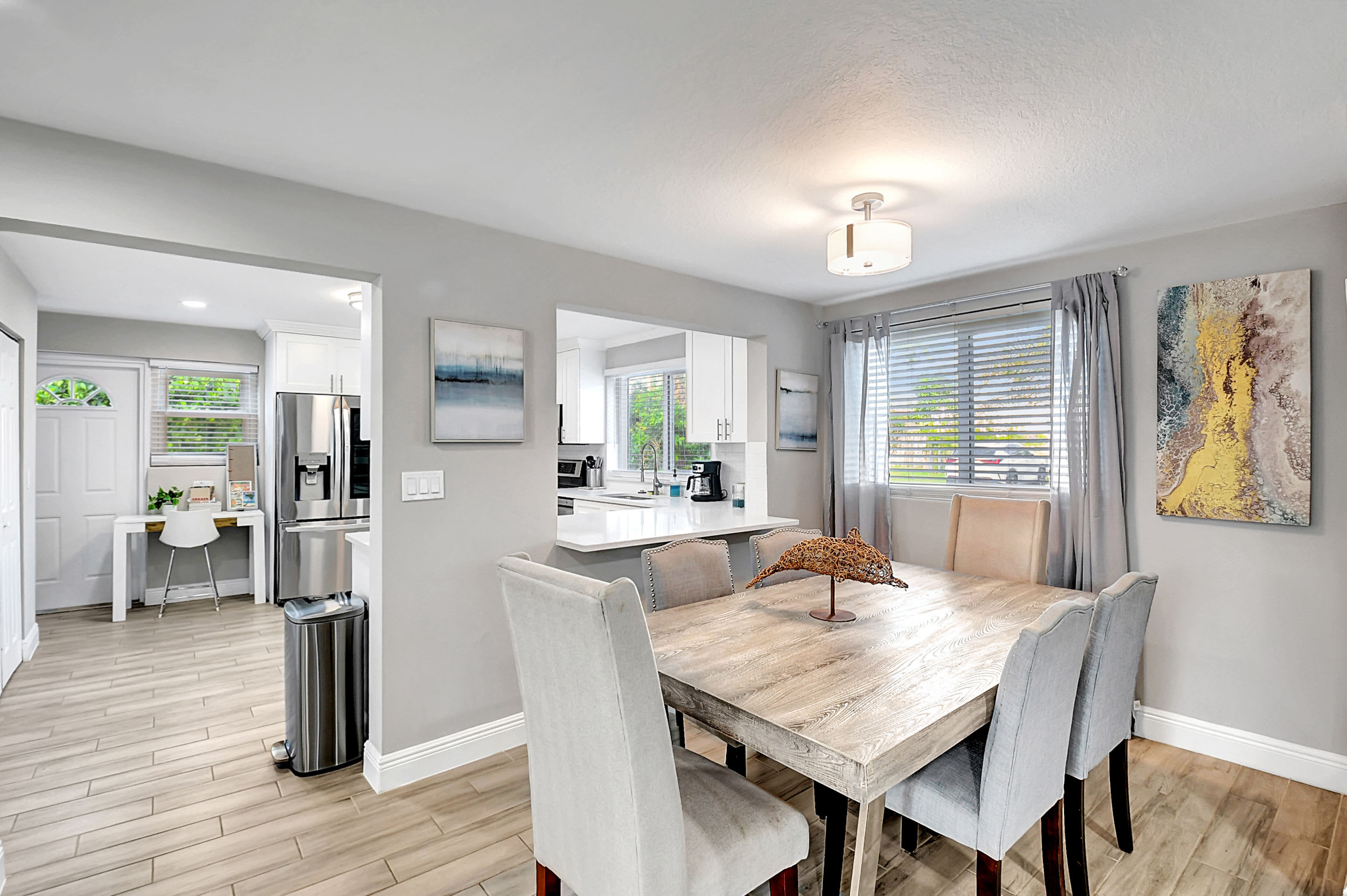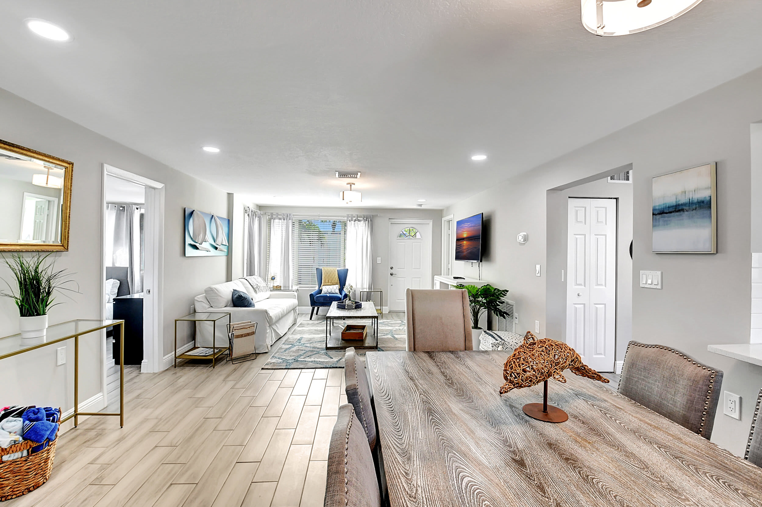 Interior: Step inside to an open, sun-filled interior featuring large windows, high-end porcelain tile flooring, and thoughtful coastal décor throughout. The fully renovated kitchen is a chef’s delight with stainless-steel appliances, sleek cabinetry, and a work desk perfect for your laptop or morning coffee. Enjoy meals together at the dining table for six, then unwind in the living area or head outside to your private backyard oasis.