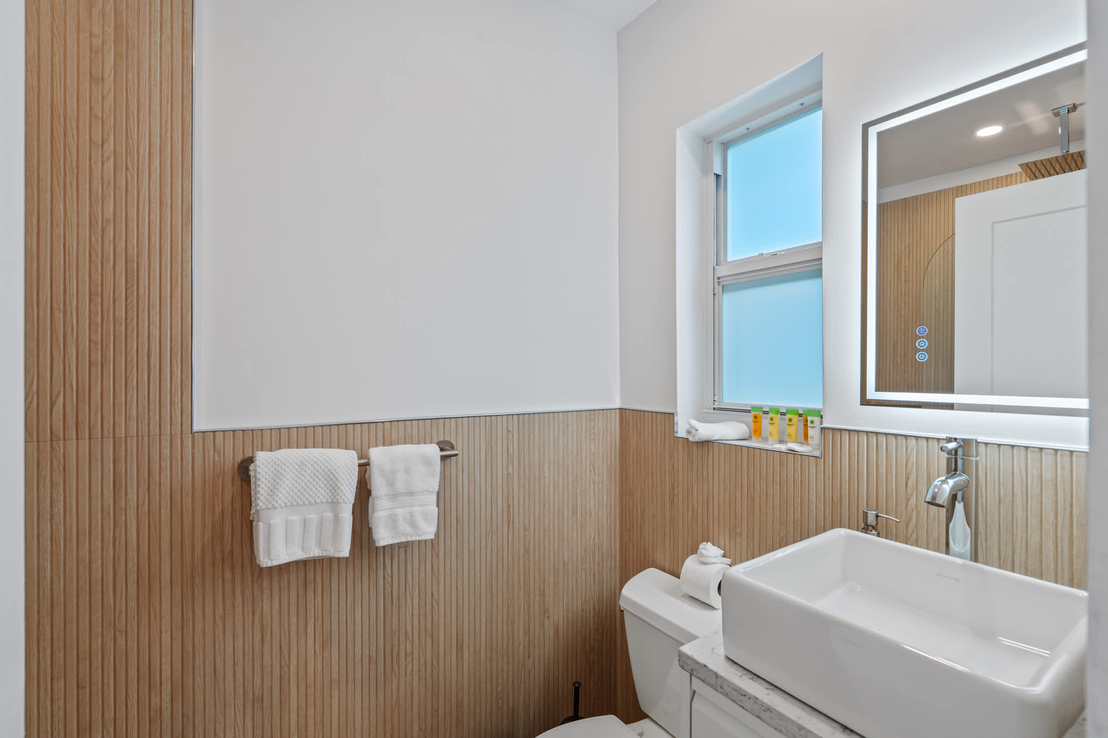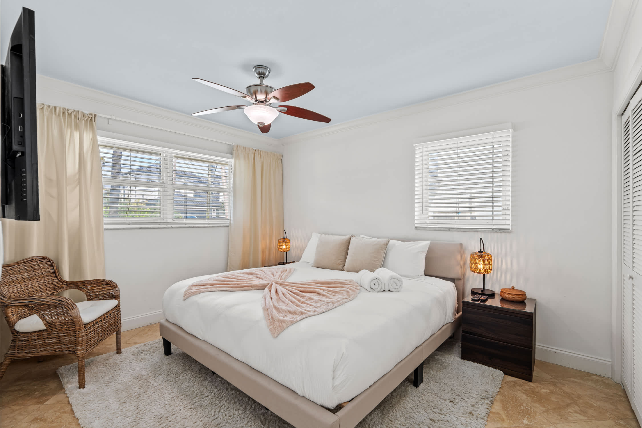 Multiple living areas include a spacious formal living room with a massive smart TV and a cozy lounge overlooking the water. Soft LED crown molding lighting adds a touch of modern sophistication and ambiance throughout. The home features 5 bedrooms and comfortably sleeps up to 9 guests. Four bedrooms include smart TVs; two offer king beds (including the master suite with pool access, walk-in closet, and ensuite bath), two have queen beds, and one offers a twin bed with private exterior access — perfect for a single guest or nanny. Every bed is dressed in hotel-quality linens with duvet covers and crisp flat sheets for a restful night’s sleep. Two of the bathrooms are wrapped floor-to-ceiling in genuine marble, featuring frameless glass showers and subtle LED accent lighting worthy of a Ritz-Carlton spa.