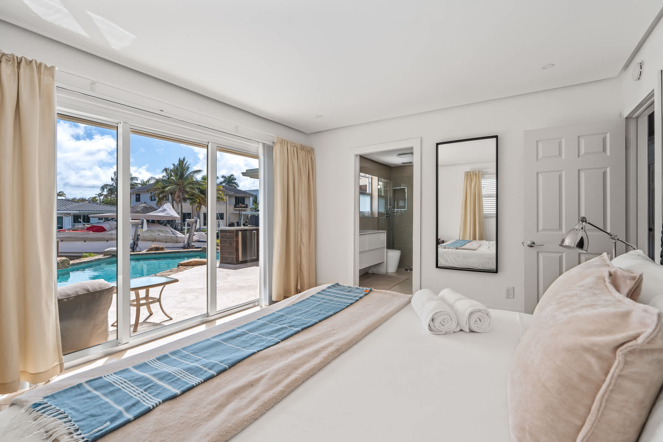 Master bedroom with a view of the pool and canal